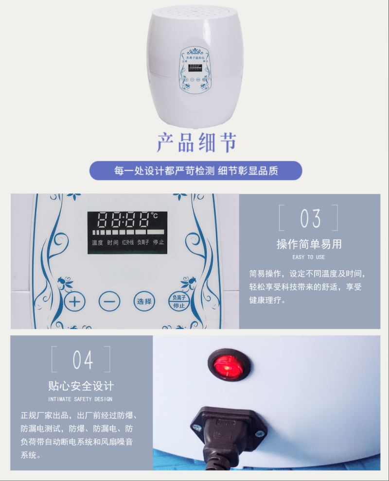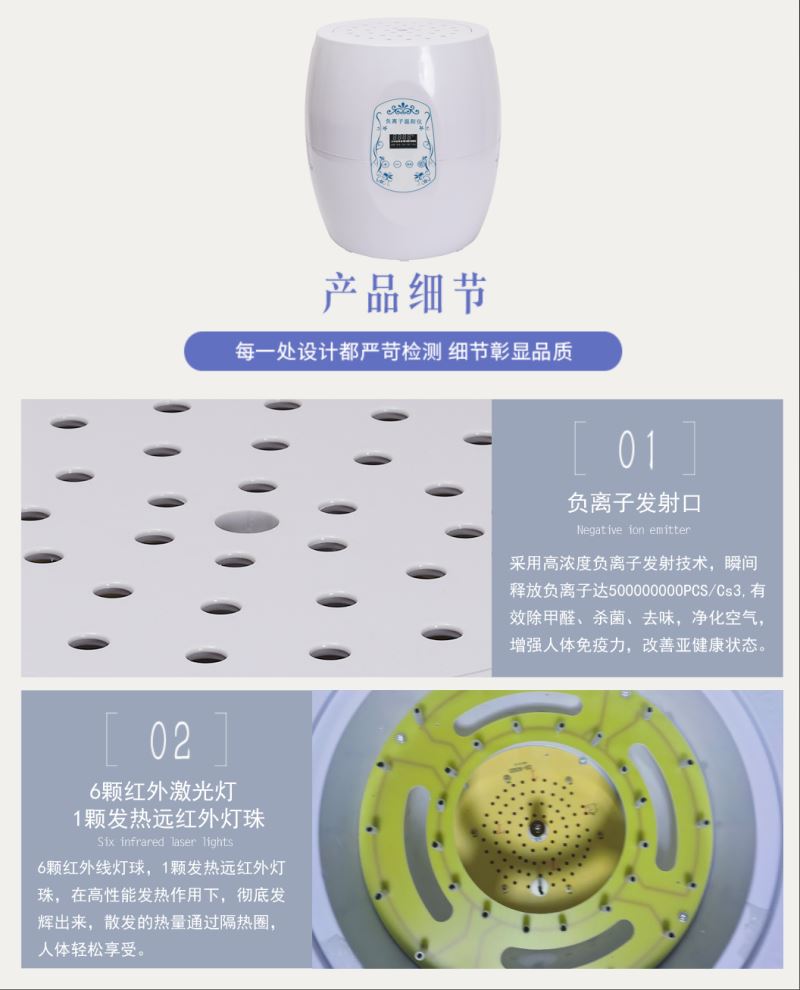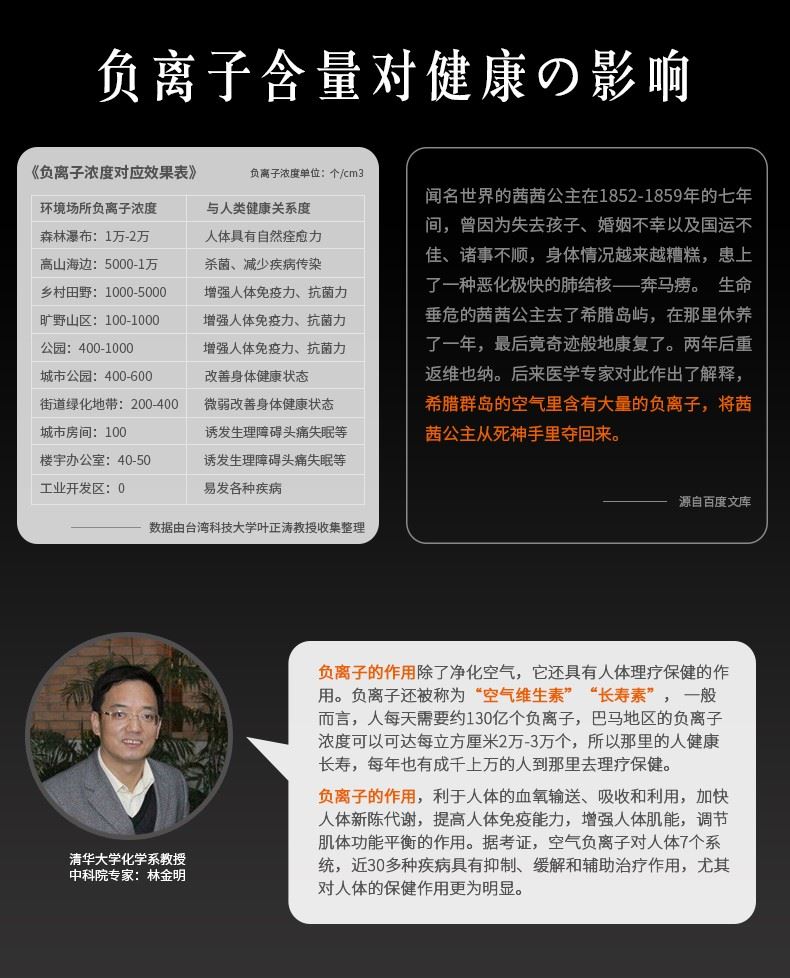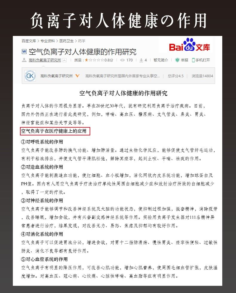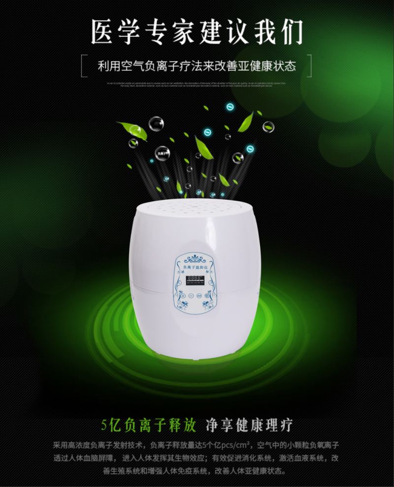 5亿负离子释放,空气中的小颗粒负氧离子透过人体血脑屏障,进入人体发挥其生物效应;有效促进消化系统,激活血液系统,改善生殖系统和增强人体免疫系统,改善人体亚健康状态。