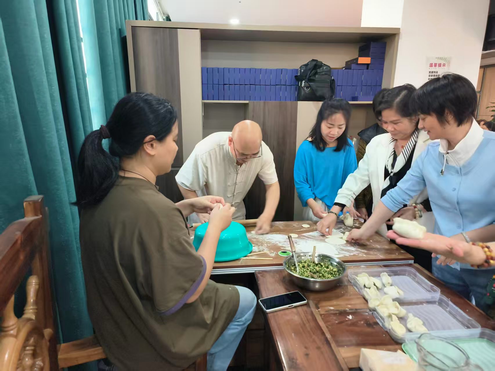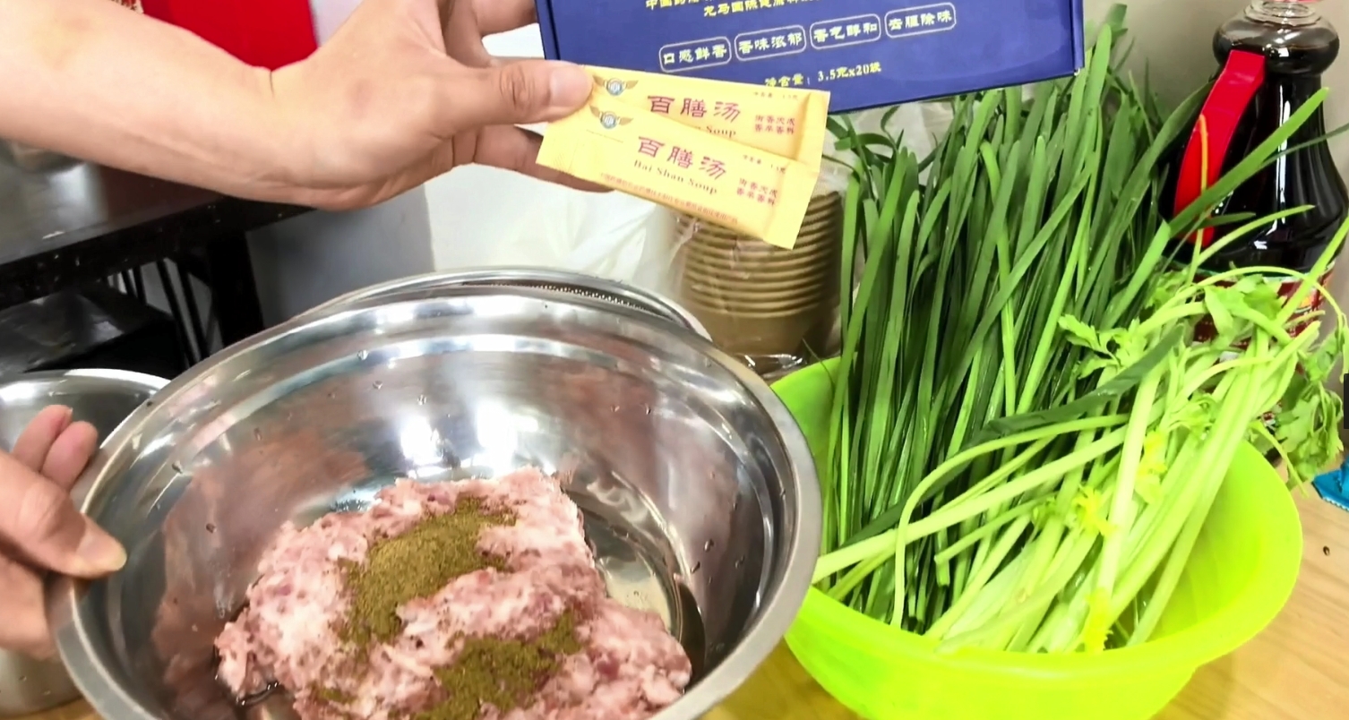 活動伊始,大家便分工明確,投入到了熱火朝天的準備工作中。在餡料區,幾位家人正圍著一大盆鮮肉與翠綠的蔬菜忙碌著。只見他們熟練地打開一包「百膳湯」,將其緩緩倒入餡料中。這「百膳湯」仿佛是點睛之筆,一經加入,原本普通的食材瞬間煥發了生機。它不僅巧妙地去除了肉的腥味,更將各種食材的鮮美味道融合、激發,讓整個餡料的香氣層次瞬間豐富了起來。